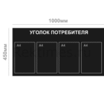 Стенд уголок потребителя на 4 карманов c вертикальной ориентацией и лаконичным дизайном отлично впишется в обстановку магазина и не будет занимать слишком много места. Подходит для небольших залов.